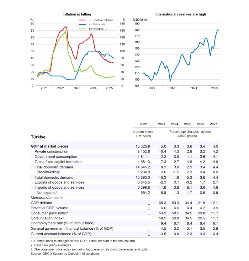 Çıktının 2025 yılında %3,6 ve 2026 yılında %3,4 oranında büyümesi, ardından 2027’de %4,0’a yükselmesi öngörülmektedir. Daha yüksek tarifeler ihracatı zayıflatacaktır, ancak bu etkinin nispeten küçük ve kısa vadeli olması beklenmektedir. İyileşen finansal koşullar, 2026 ve 2027’de özel tüketim ve yatırımı destekleyecek ve bu da daha güçlü ithalatı tetikleyecektir. Enflasyonun düşüşünün devam etmesi öngörülmektedir. Ana enflasyonun 2027 sonunda %10’a düşmesi beklenmektedir, ancak bu öngörüye ilişkin yukarı yönlü riskler önemli ölçüde devam etmektedir.
